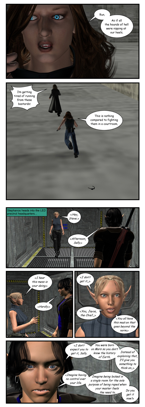The conversation between Stephanos and Sally went through many rewrites. Originally, I didn't want to use a strong word such as "rape" but then, after some thought, I realized that it was one of the exact reasons that Steph has such a huge beef against Puritan. So, the conversation stands as is.